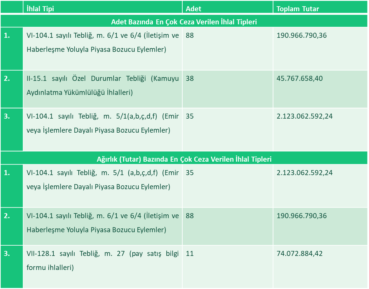 2025 yılında VI-104.1 sayılı Tebliğ m. 5/1 kapsamında verilen cezalar 35 ayrı ihlal ile sayı bakımından üçüncü sırada yer almakla birlikte, 2.123.062.592,24 TL ile toplam ceza tutarı bakımından ilk sıradadır. Bu tutar, 2025 yılında uygulanan toplam idari para cezalarının yaklaşık %78,9’unu oluşturmaktadır. Bu kategoride tek bir gerçek veya tüzel kişiye uygulanan en yüksek ceza 362.123.139,86 TL olmuştur.
