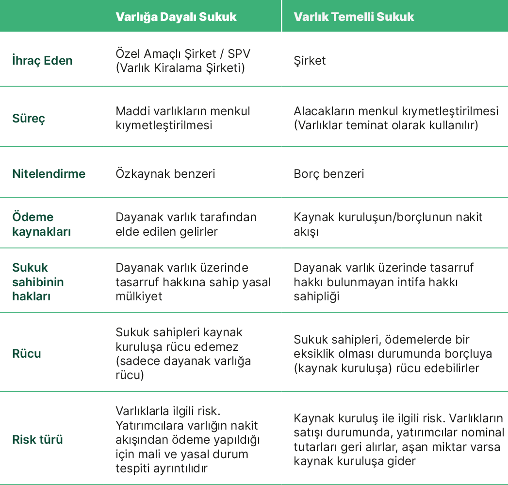 Aşağıdaki tablo, 'varlığa dayalı' ve 'varlık temelli' sukuk arasındaki temel farkları gösterir.[6]