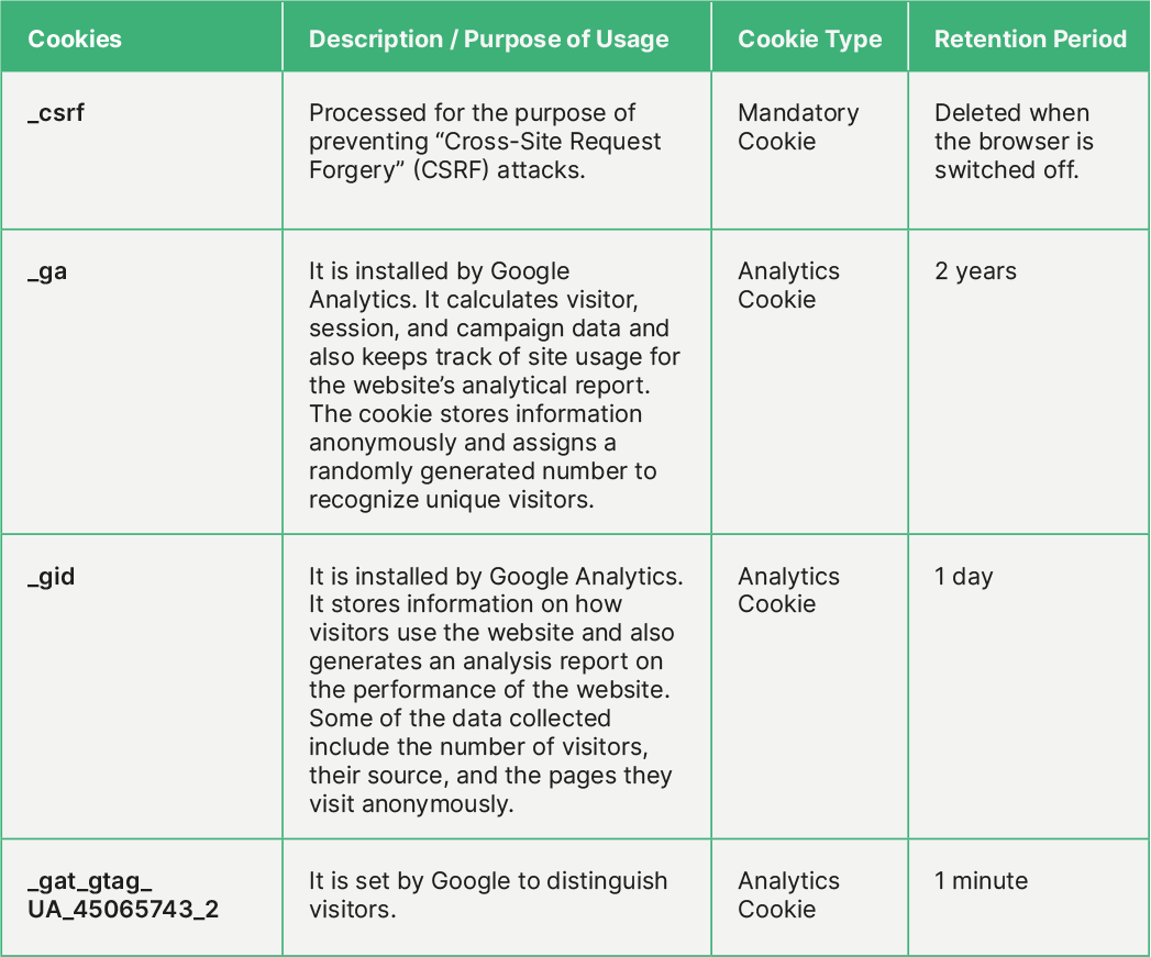 A cookie is a type of text file placed on a visitor's device by website operators and transmitted as part of an HTTP(S)3 request. Cookies enable a site to recognize visitors' devices and contain small amounts of information. The data collected through cookies are generally used to improve the experience of visitors on the website, to increase the performance and efficiency of the website, and to determine visitor habits, for security and advertising/marketing purposes. Cookies collect information such as browser type, time spent on our website, pages visited, language preferences, and other anonymous traffic data.