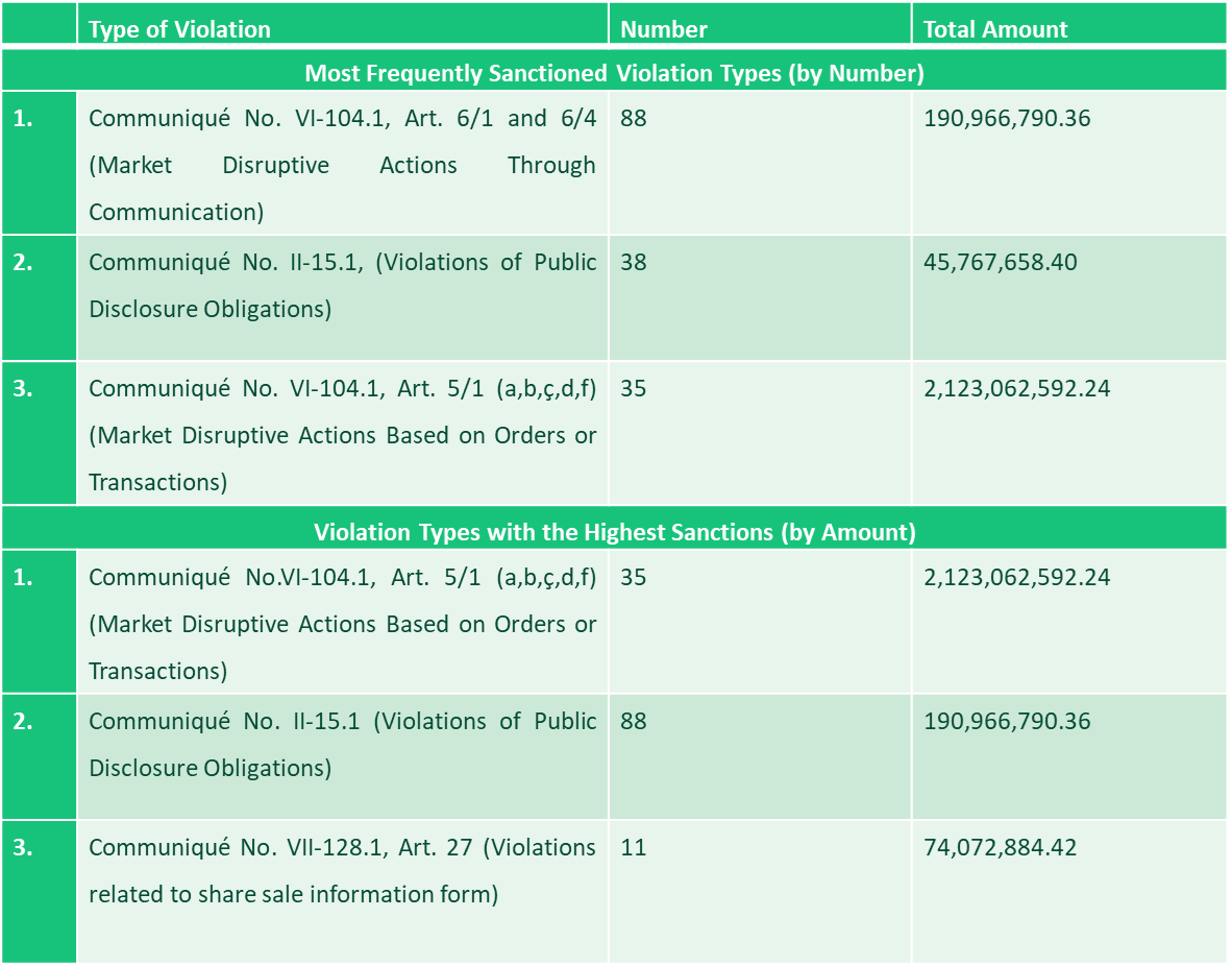 This article examines, within the scope of administrative monetary fines imposed by the Board, market disruptive actions and breaches of disclosure obligations that stand out in terms of both frequency and the magnitude of fines. Comparative data on the types of violations that stood out in 2025 in terms of number and monetary amount are presented in the table below: