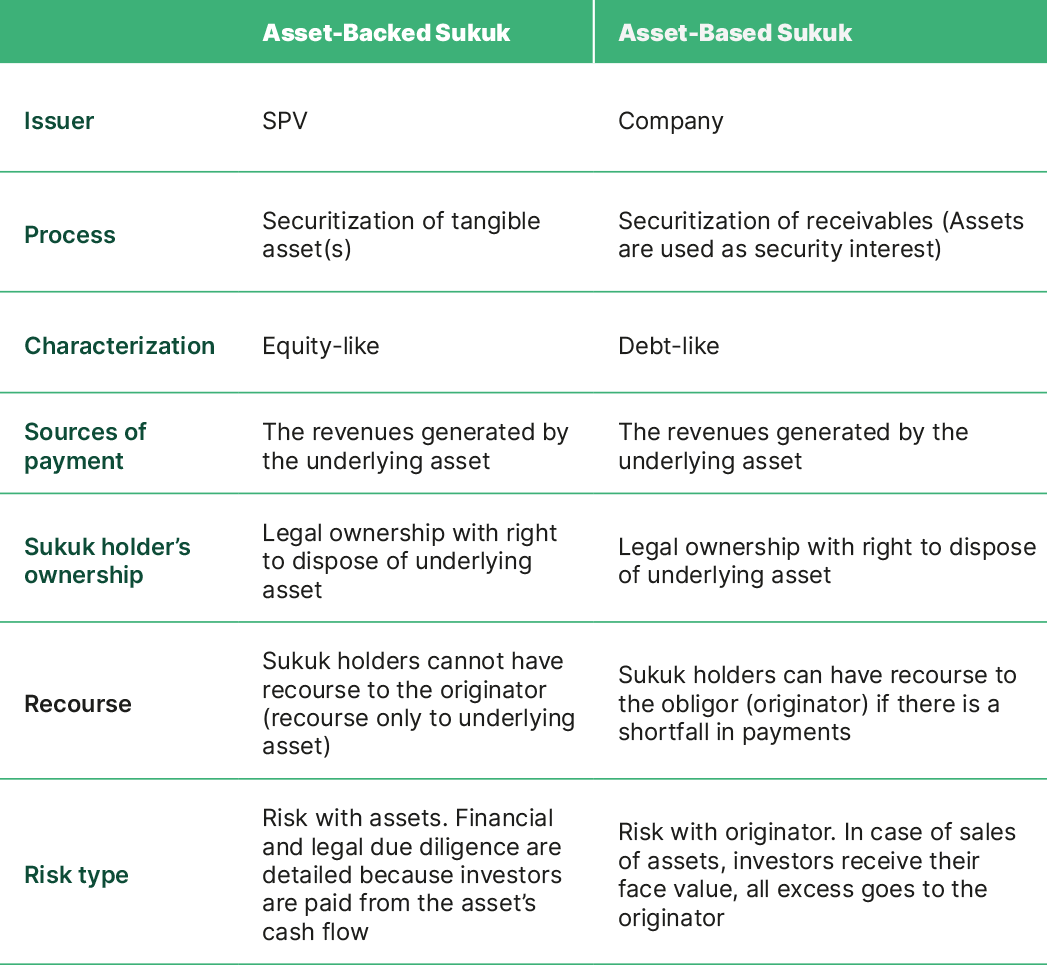 The table below shows the fundamental differences between “asset backed” and “asset based” Sukuk:[6]